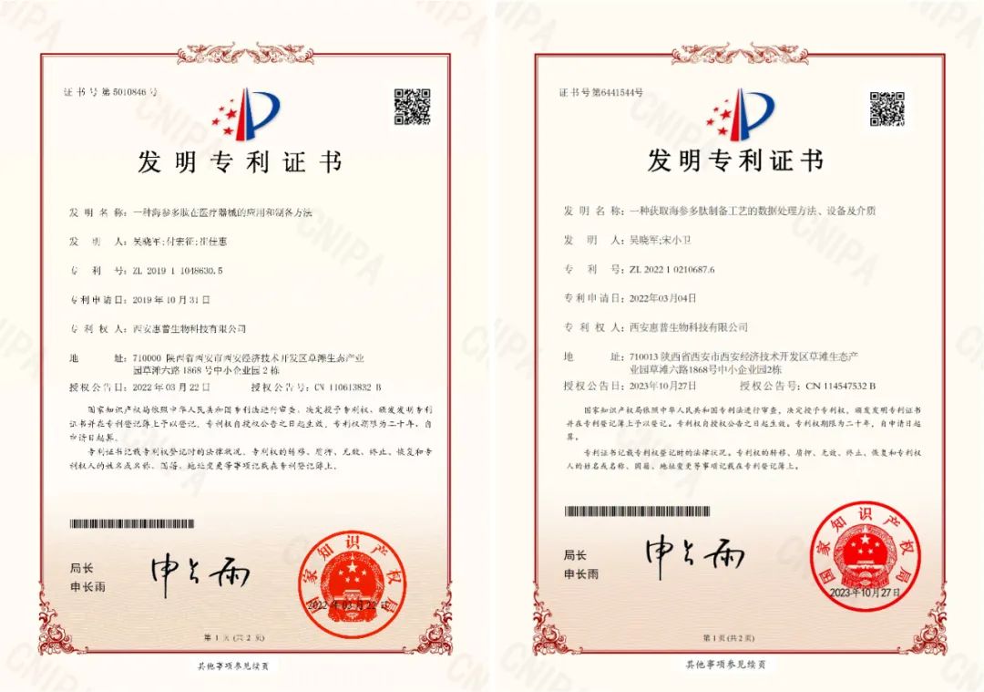 另一方面,惠普生物非常注重知識(shí)產(chǎn)權(quán)保護(hù),充分發(fā)揮自身的創(chuàng)新研發(fā)優(yōu)勢(shì),積極布局原料和平臺(tái)技術(shù)方面的專利,先后獲得了:一種海參多肽在醫(yī)療器械的應(yīng)用和制備方法(ZL 2019 1 1048630.5)及一種獲取海參多肽制備工藝的數(shù)據(jù)處理方法、設(shè)備及介質(zhì)(ZL 2022 1 0210687.6)兩項(xiàng)中國(guó)發(fā)明專利,這是技術(shù)革新中實(shí)踐和探索的結(jié)晶,而化妝品新原料的成功備案,可以說(shuō)是惠普生物海參肽的第三個(gè)里程碑。